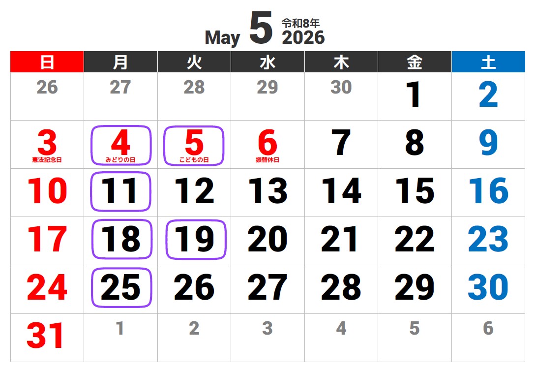 定休日のお知らせ【5月】 紫枠が定休日となります。 COOL Hair session【本町店】 COOL Hair rhythm【上田店】 A.s.h【高松店】は 毎週(月)(火)連休です - 新着情報一覧に戻る -
